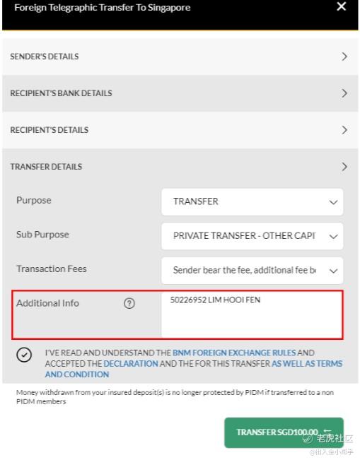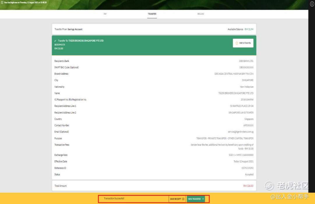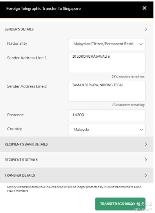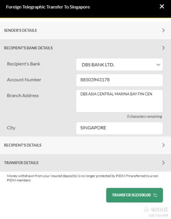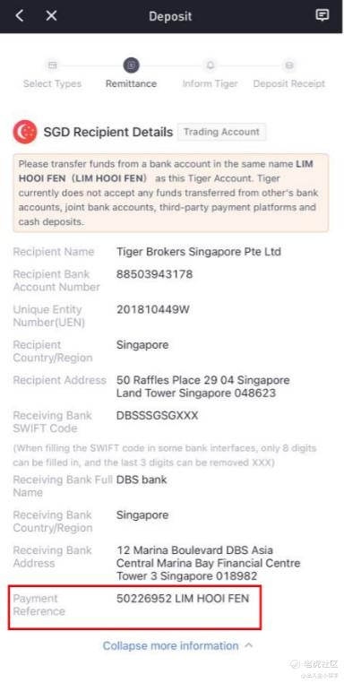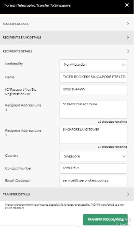 5.Fill in recipient’s bank details and recipient’s details, with reference to the SGD Recipient Details which you can find on the Deposit page on Tiger Brokers App.