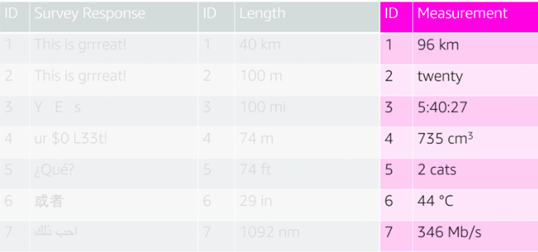 有时数据的问题会更加复杂。一列数据可能会包括不同的特征。例如同样是叫做测量值(Measurement)的一列,里面可能有温度,距离,时间等等数值。这种情况下,就要对数据变形,使每一列对应一个特征。