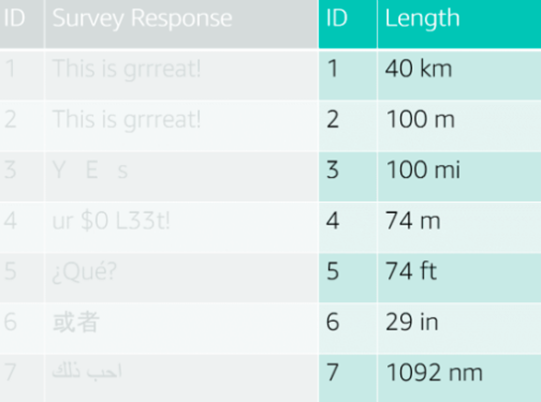 数据中可能还会有单位的问题。例如长度可能是米,千米,英里等。这是一个常见问题,因为很多数据来源不同。当合并不同的数据集以后,就会出现这个问题。