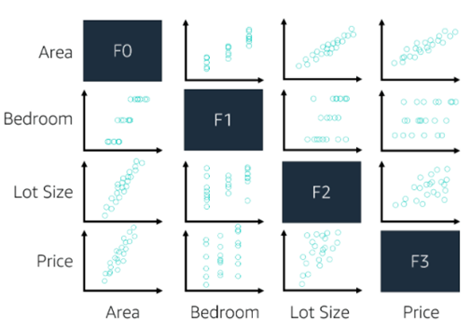 我们可以利用散点图直观地表现数值型变量的关系。当一个数据集中有两个以上数值型变量的时候,我们可以用散点图画出它们的关系。这样就可以发现变量之间的特殊关系。例如,在下图中,我们可以看出,有一些变量之间具有强线性关系,而另一些变量之间则没有强线性关系。