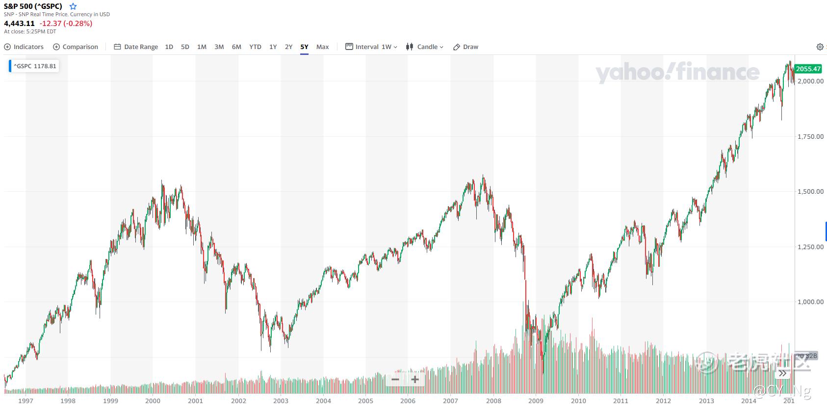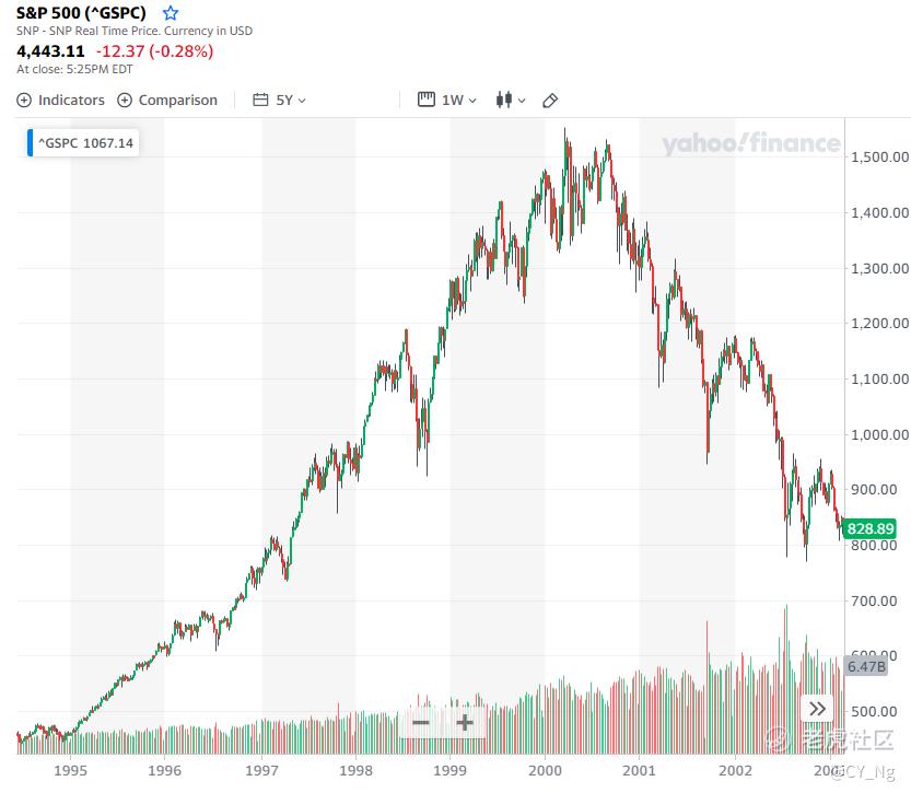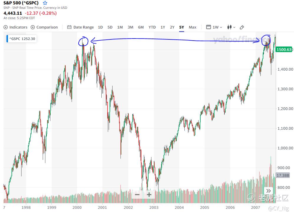 就拿2000年的S&P500来说,如果你站在2000年那时候看股价估值,是不是同样的说股市太疯狂了。S&P500在短短5年涨了两倍,从500点涨到1500点。