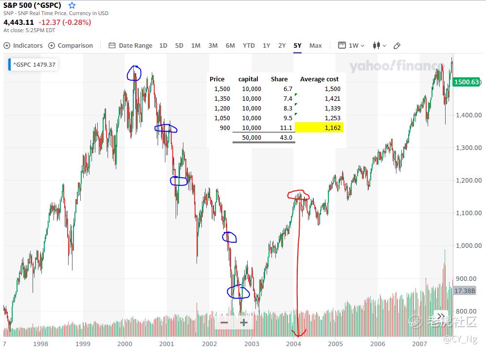 但如果你好像我这样,还是有打工收入的,可以在股市一直下跌,一直购买更便宜的股票,从中把平均价拉低,同一张图只需要4年就可以回本了,当股价去到2007年高峰时还有30%回报。