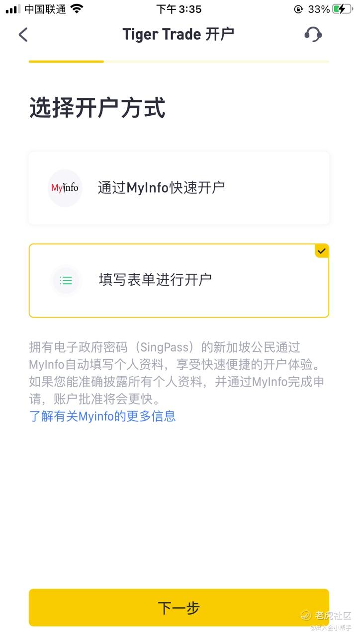 3.选择开户方式,这里有两个渠道,第一种是通过Myinfo快速开户:第二种如果没有myinfo, 可以选择【填写表单进行开户】手动填写信息。