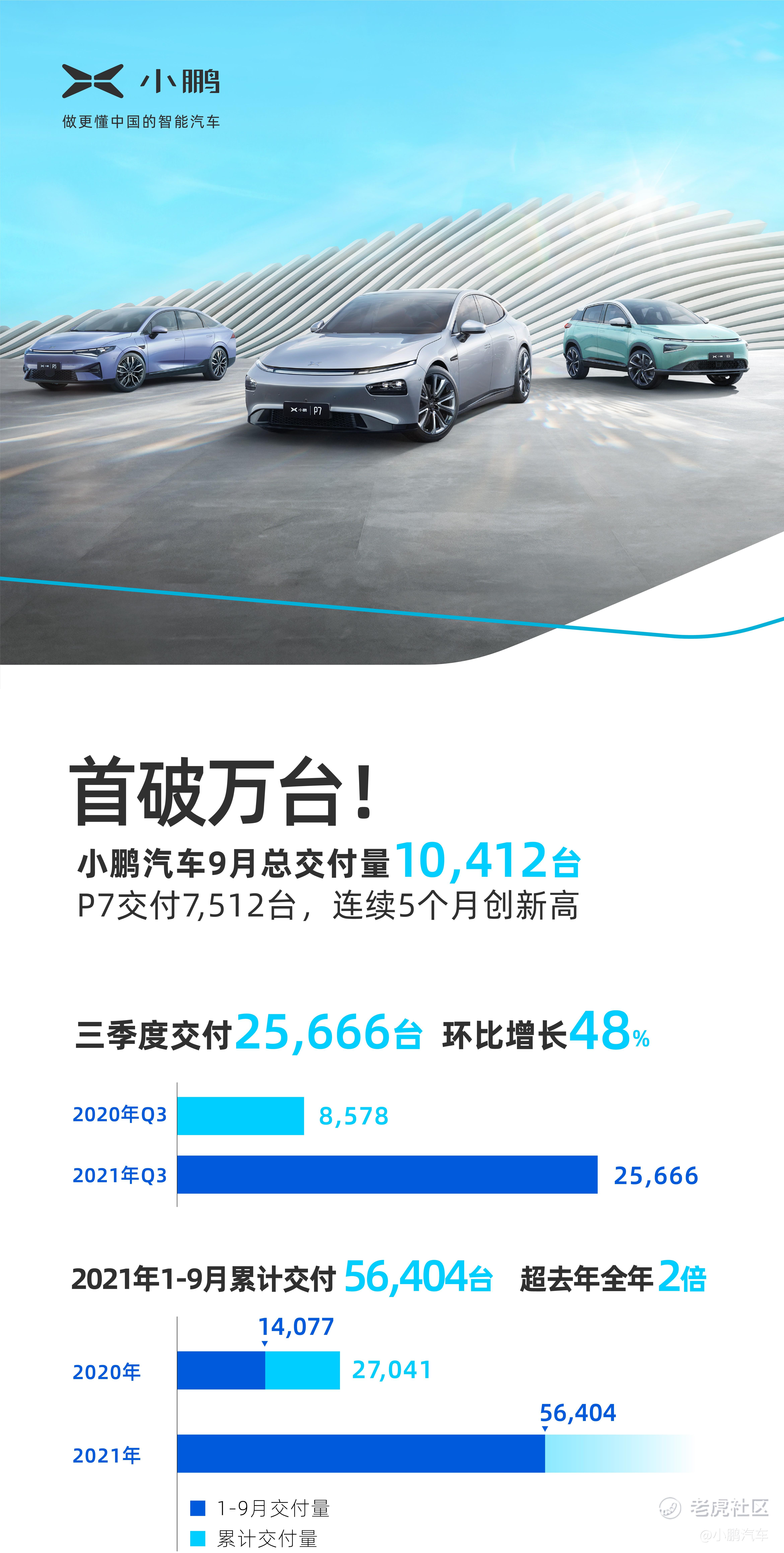 9月份的成绩单如期而至,30天,我们创造了5个新纪录!这是我们第一次月交付破万,小鹏汽车进而成为造车新势力中第一家月交付过万的企业,并且,除了靓丽的总数字,我们还追求更多维度的突破。