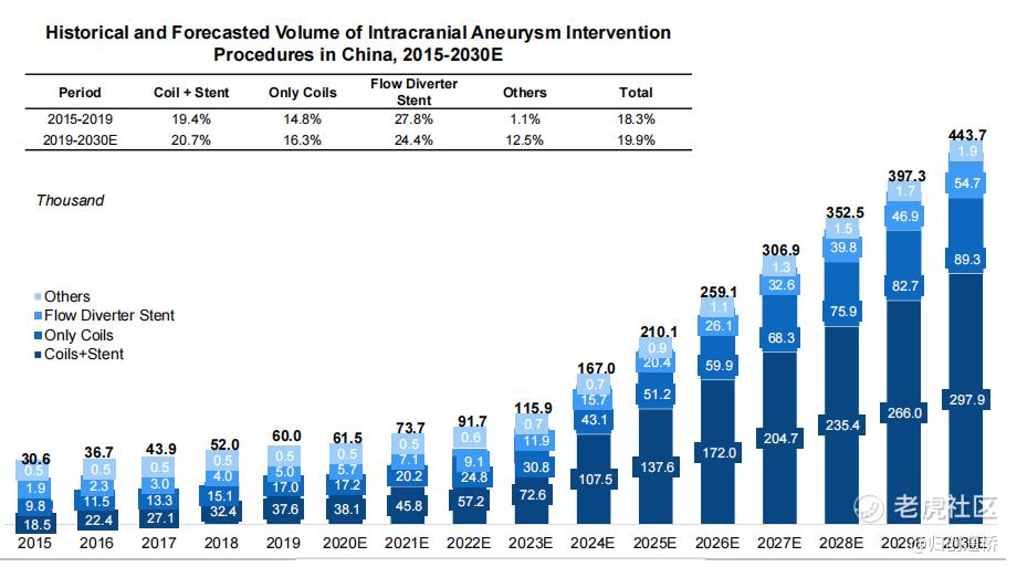 随着中国人口老龄化的加剧及国内神经介入技术的快速发展,我国的神经介入医疗器械市场快速增长。《中国脑卒中防治报告(2020)》指出,我国颅内动脉瘤的检出率高达7%,且呈现逐年上升趋势。根据弗若斯特沙利文分析,中国颅内动脉瘤介入手术量由2018年的5.2万台到2021年7.37万台,到2030年将进一步增加到44.4万台,市场空间巨大。