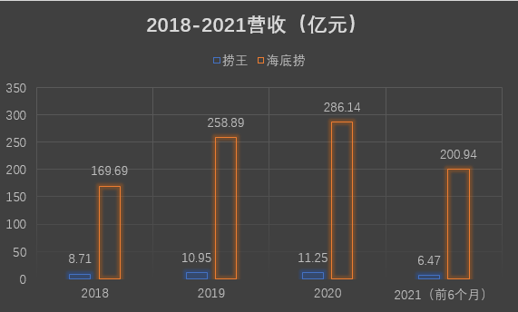 但从当下来看,无论是规模体量、收入盈利,还是市场地位、品牌影响力,都无疑是一场实力悬殊的角逐:要知道,从1994年第一家门店成立,到2018年港股上市,再到现在千亿元市值,海底捞在火锅圈已经立足脚跟、稳居榜一。而捞王从财务表现来看,和海底捞也确实不在一个量级。