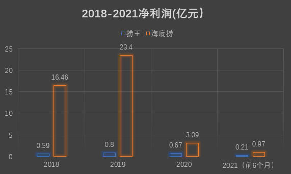 而海底捞2018年至2021年上半年,海底捞的营收分别为169.69亿元、258.89亿元、286.14亿元、200.94亿元,2019年和2020年的营收增速分别为52.56%、10.53%;净利分别为16.46亿元、23.4亿元、3.09亿元、9650.8万元,净利增速分别为42.16%、-86.80%。