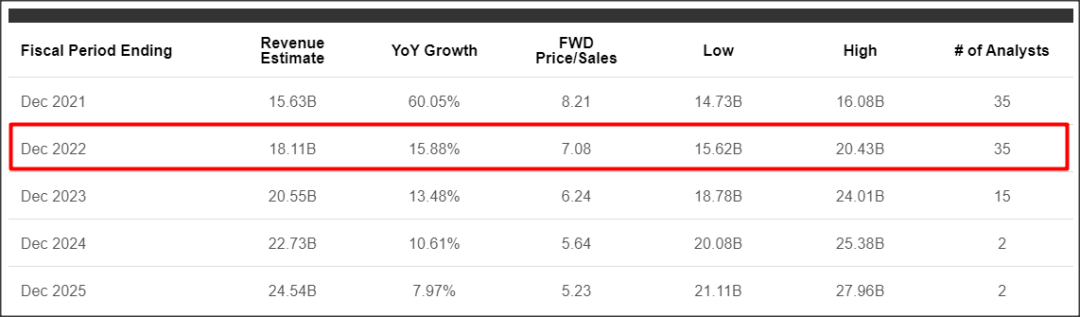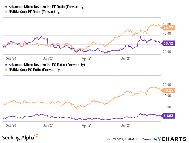 AMD 市值连续两个月下滑,使得 AMD 的市盈率降至 33.1,市值与销售额之比降至 6.8(基于低收入估计)。AMD 可以在 2022 财年产生 $22.0B 的收入,这意味着同比增长 41%(不是 16%),这将 PS 比率降低到 5.7。