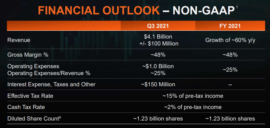 由于市场份额增加、GPU 定价强劲以及 2021 财年前两个季度的收入增长加速,AMD 在第二季度上调了全年收入预期,预计 2021 年收入同比增长 60%。AMD 的内部收入增长估计使该公司在 2021 财年的预期收入接近 $15.6B。