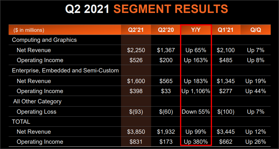 在第二季度,AMD 的计算和图形收入同比增长 65% 至 2.3B 美元,包括 EPYC 服务器处理器销售额在内的企业收入同比增长 183% 至 1.6B 美元。EPYC 处理器收入和半定制产品销售额的增长推动了业务部门同比增长 183%。