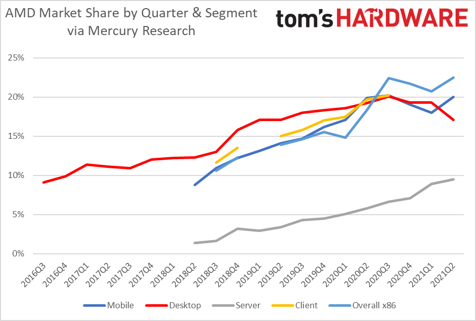 自 2018 年以来,AMD以牺牲英特尔 ( INTC )为代价在服务器市场取得了重大进展,并且 AMD 的市场份额在 2021 年持续增长。根据备受尊敬的研究公司 Mercury Research 提供的信息,AMD 的市场份额为9.5%第二季度服务器 CPU 的市场份额。