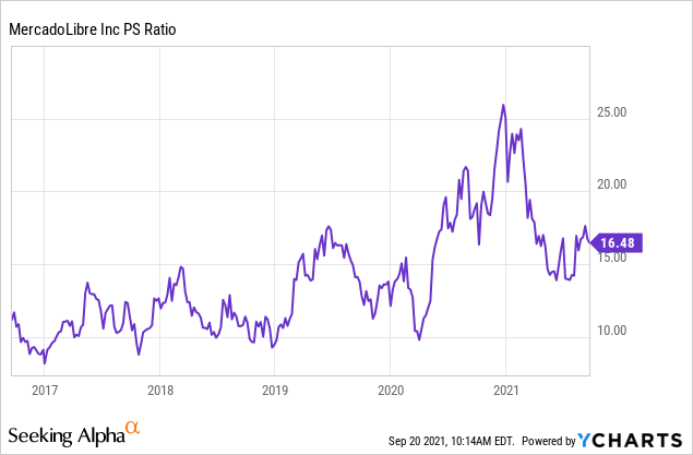 估值倍数不仅绝对值高,而且与公司自身的历史相比也高。它通常在 10 倍到 15 倍的销售额之间交易,目前约为 16 倍。部分扩张可归因于金融科技业务的比例不断增长,但目前很难说股价便宜。
