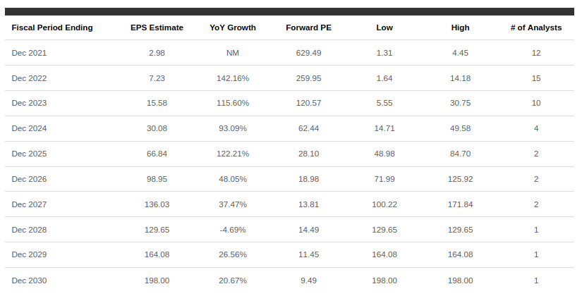 根据 Seeking Alpha 编制的分析师估计查看特征收益,我们看到从 2026 年左右开始,股票的市盈率倍数开始看起来便宜。如果投资者是长期投资者并认为这些估计是准确的,那么一个案例可用于购买股票。