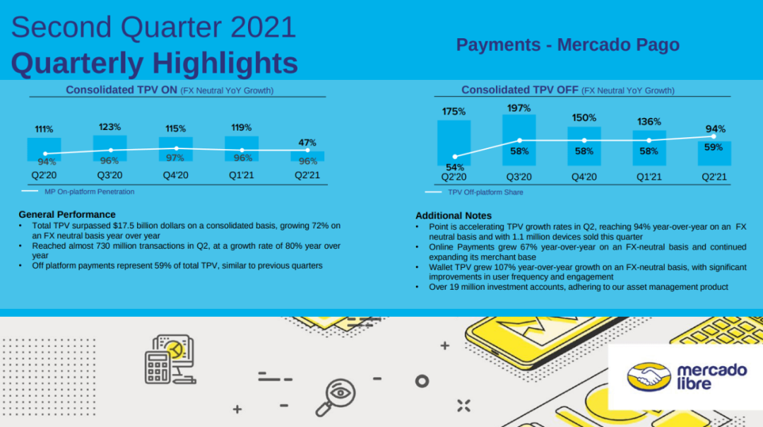 与此同时,在 MercadoPago 方面,以当地货币计算的总支付额增长了 72%,达到 175 亿美元,其中 103 亿美元来自电子商务平台之外。支付交易总额为7.3亿笔,同比增长80%。最后,信贷发放额为 7.03 亿美元,同比增长 429%。