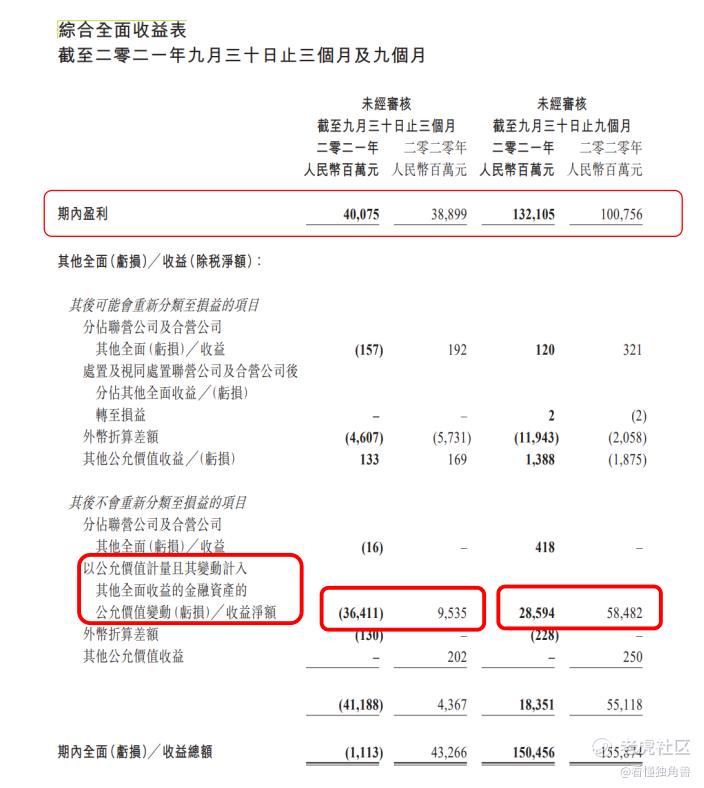 答案很简单,腾讯的期内全面收益主要包括两部分,一部分是主营业务收入,这部分是盈利的,依然稳健,而另一部分是投资形成的资产收益,这一部分的收益是由公允价值得来的,造成腾讯第三季度亏损的,恰恰就是这个“以公允价值计量且其变动计入其他全面收益的金融资产”带来的公允价值波动。