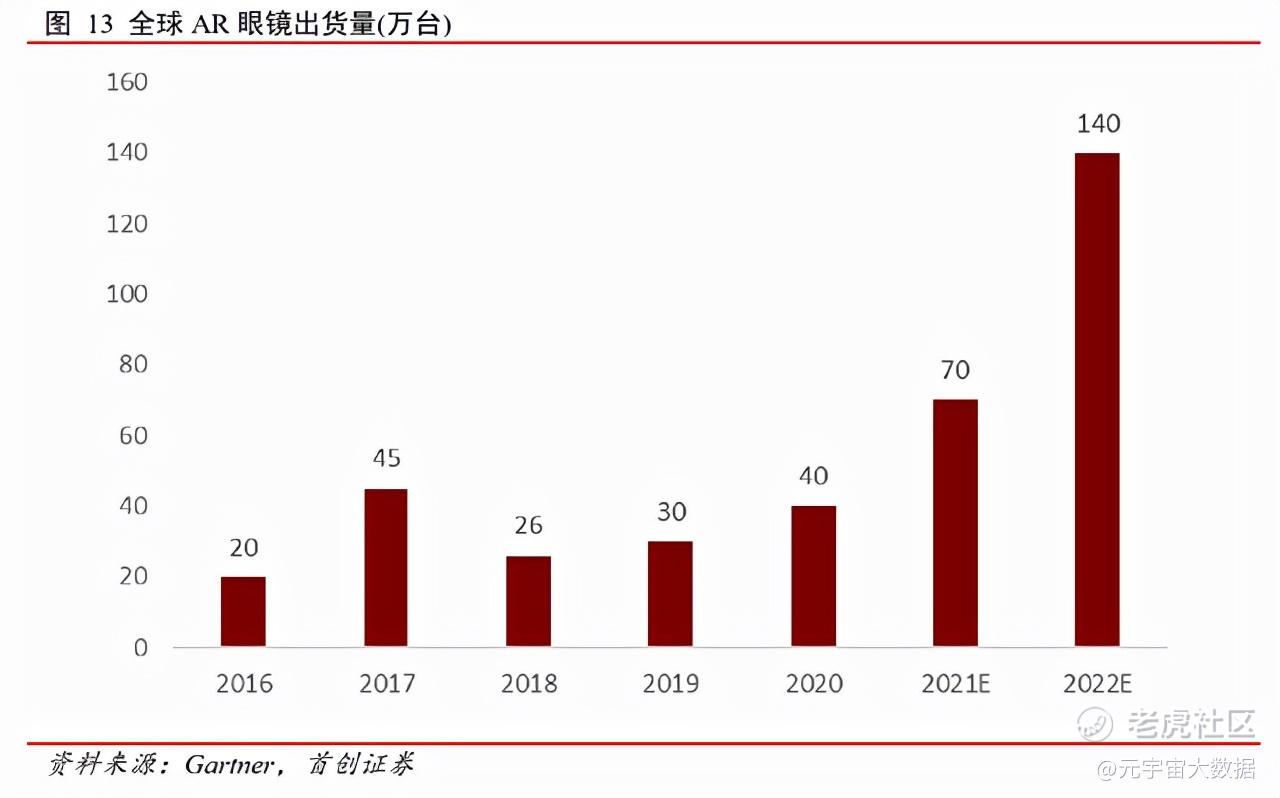 全球AR眼镜出货量的变化也佐证了这一趋势。2015-2019年,产业经历了从快速增长到相对停滞的过程。2020年,全球AR行业受到各国疫情居家隔离政策利好影响,出货量大增。首创证券认为,伴随5G通信技术的发展,AR/VR的上升趋势可能持续,出货量将继续走高。
