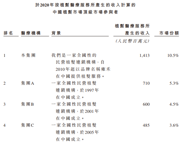 雍禾医疗于2005年在北京成立,按2020年相关所服务产生的总收入计,雍禾医疗是中国植发医疗服务及医疗养固服务市场规模最大的企业,分别占有10.5%及4.3%的市场份额。截至2021年11月22日,雍禾医疗在全国52个城市经营53家医疗机构,建立了一支由1,233人组成的行业内规模最大的专业医疗团队,其中包括246名注册医生及919名护士。