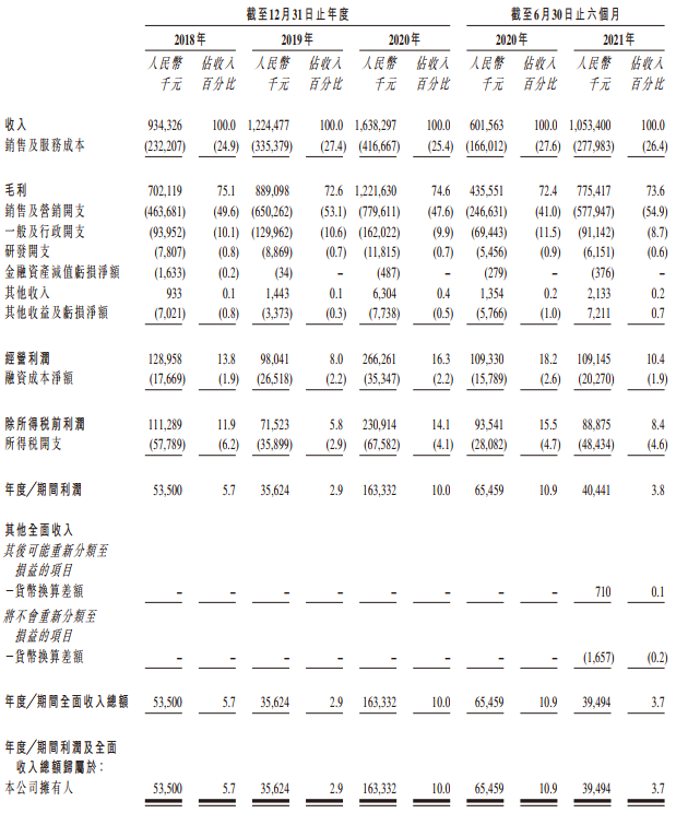 在营收方面,2018至2020年雍禾的营业收入分别为人民币(下同)9.34亿、12.2亿、16.4亿,复合年增长率达32.4%。截至2021年6月30日止六个月,雍禾医疗营业收入为10.5亿元,较2020年同期增长75.1%。雍禾的收入主要来自提供植发医疗服务,而来自医疗养固服务的收入也于同期实现了快速增长。利润方面,2018年至2020年,雍禾医疗净利润分别为5350万、3560万和1.63亿元。截至2021年6月30日止六个月的净利润为4040万。