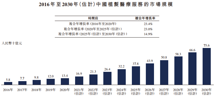 2020年,在中国进行的植发手术仅约为51.6万例。因此,中国的植发渗透率(按接受植发人数除以脱发患者人数计算)于2020年仅为约0.2%,表明存在巨大的未获满足的市场需求及庞大的增长潜力。此外,随着美学植发的出现、植发选择的扩大及服务创新,预计中国的植发客户群将从脱发患者扩展到大量寻求通过医学治疗改善外貌的消费者群体,预计到2030年将带动中国植发服务市场规模达到人民币756亿元。下图载列中国植发医疗服务的历史及预测市场规模: