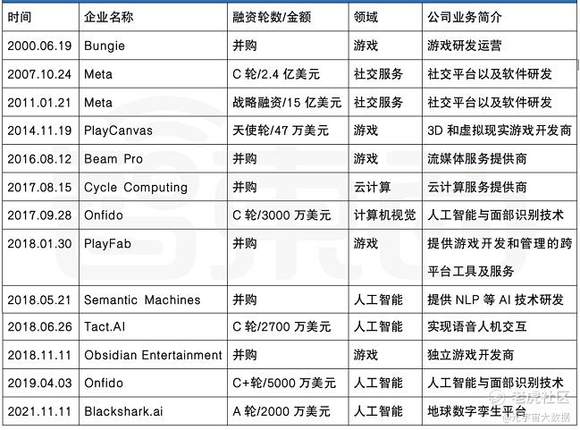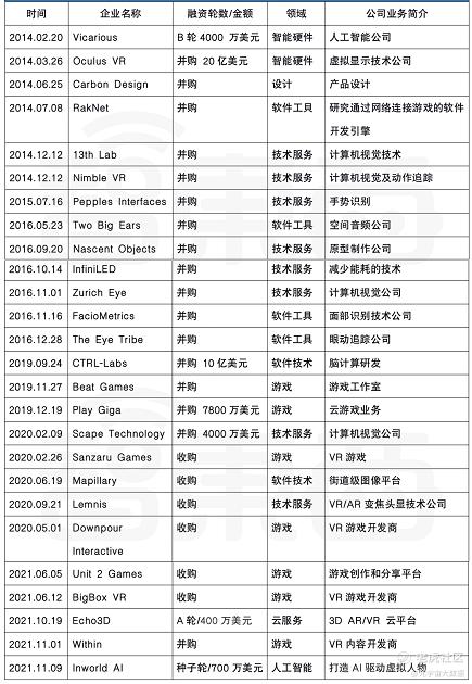 据了解,Meta从2014年开始共投资了23家与元宇宙相关的公司,涉及智能硬件、软件工具、计算机视觉、游戏等多个领域。
