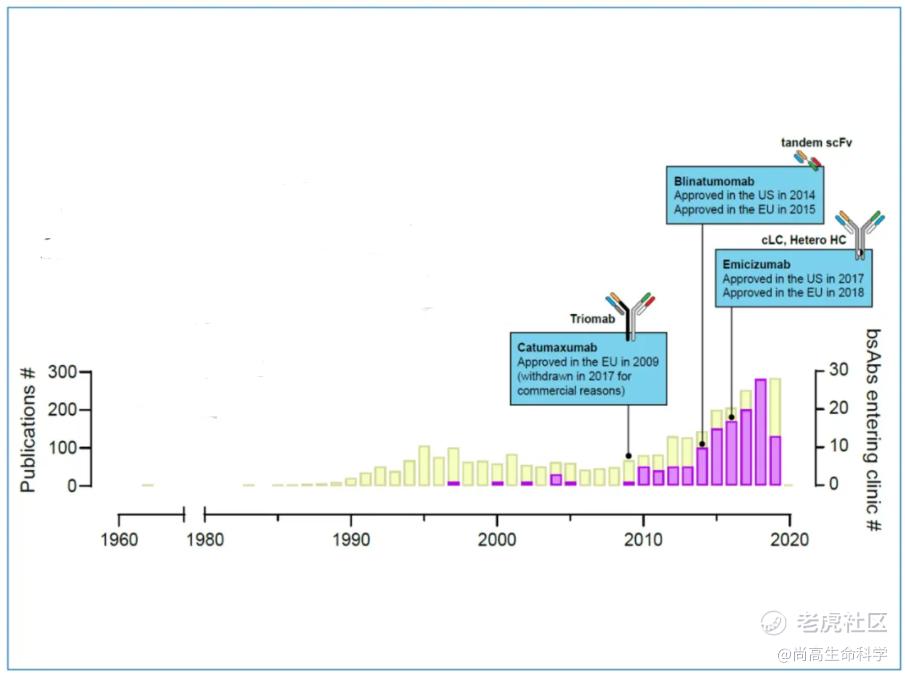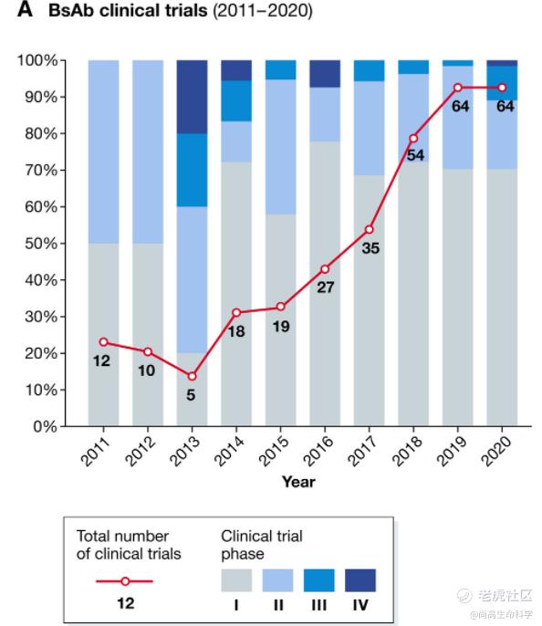 双抗的繁荣体现在近几年申报临床产品的集中爆发。2000年,每年大约只有一个双抗进入临床,在2010年代前半期,每年约有六个。在过去6年里,每年平均有27个双特异抗体进入临床。