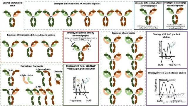 跟单抗相比,由于双抗的杂质组成更复杂多样,特别是杂质在结构上和物化特性上跟目标双抗产物之间还非常接近,使得下游工艺开发更是困难重重。双抗的杂质组成中除了常见的宿主细胞蛋白和宿主细胞基因,还包括各式各样错配产物,抗体片段和聚合物。以不对称双抗为例(如果允许四条链之间随机配对),在上清液中的错配产物可能占到总蛋白表达量的90%以上。