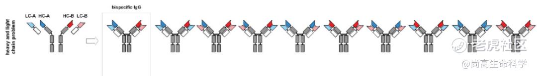 “错配”是双抗生产中出现的最大难点。双抗设计主要是通过共表达两条不同的重链和两条不同的轻链,来实现可以同时特异性结合2个不同抗原或两个不同抗原表位的目的。如果允许这四条链之间随机配对,理论上有可能产生10余种不同组合,而其中只有一种是正确的双抗产物。因此生产过程中,所能获得目标双抗产物的表达量相对较低。