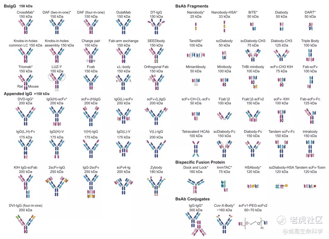双抗在自然界并不存在,需要通过重组DNA技术或细胞融合技术人工制备。双抗在结构上相比单抗更加多样。双抗根据是否具有Fc区可以分为全长双抗和片段双抗,根据结构左右对称可以分为对称结构和非对称结构,根据抗原结合区域的数量可以进一步分为二价、三价、四价或更多价构型。目前,已知至少有100多种双抗结构被报道。同时也因为双抗这种药物结构的特殊性和多样性给生产工艺与质控提出了巨大的挑战,双抗研发中的二硫键错配、稳定性差、免疫原性高、分子聚合、半衰期短等问题屡见不鲜。