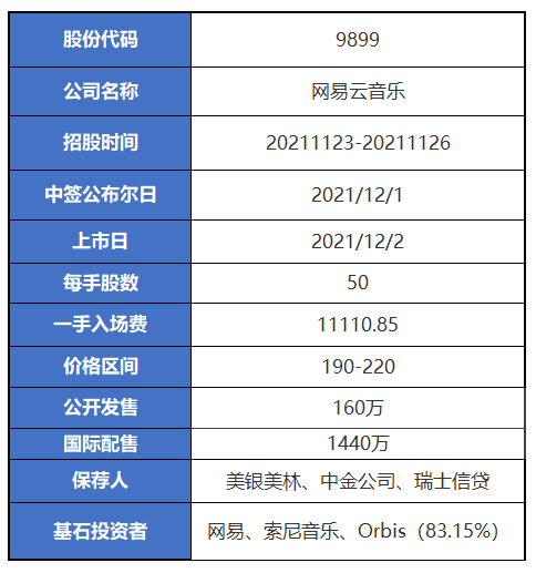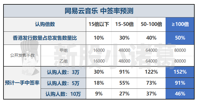 网易云音乐(9899.HK)正在招股,一手入场费11110.85港币,价格190-220港币,一手50股,预计参与人数为3-10万左右,预计一手中签率60%+,预计5手可中一手,预计乙头可中50手左右。乙头600手,666万港币,20倍孖展需本金约33万港币。本次乙组大概率中签市值超过本金。