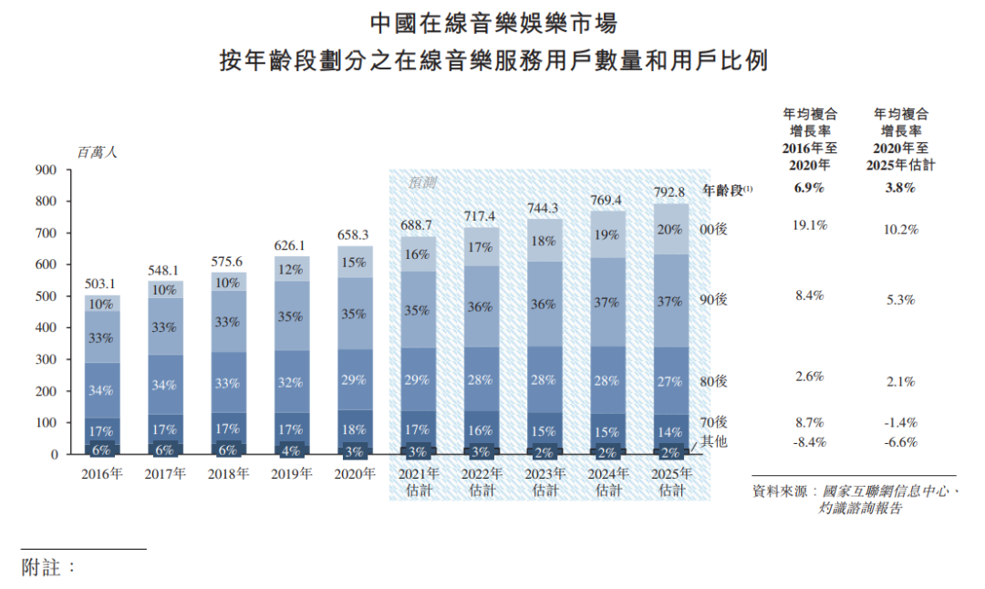 根据中国互联网络信息中心数据显示,2020年中国在线音乐娱乐市场用户人数达到658.3百万人,而根据灼识咨询报告,2025年该数字将会达到792.8百万人。其中,1990年或之后出生的用户占2020年中国在线音乐娱乐市场全部用户近50%。1990年或之后出生的用户规模的增长速度预期将高于其他年龄段,而他们占全体用户的比例将于2025年进一步增加至57%。