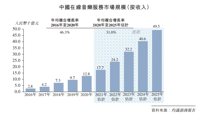 在线音乐服务的市场规模由2016年的人民币28亿元增加至2020年的人民币128亿元,年均复合增长率为46.3%,预期2025年将达到人民币495亿元,年均复合增长率为31.0%。促进该增长的主要因素乃由于会员付费比率快速上升,由2016年的2%增长至2020年的8%,预期2025年将达到27%。