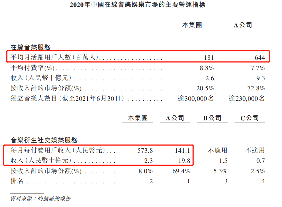在线音乐服务市场:整个市场上,在线音乐服务基本上就是网易云和腾讯音乐(以下简称“网易”和“腾讯”)垄断93%以上的份额。A公司就是腾讯音乐,对比一下腾讯音乐和网易云音乐,我们可以发现的是,腾讯音乐的体量是远远超过网易云音乐的,2020年拥有6.44亿人,网易云音乐拥有1.81亿,体量上,差了4.63亿人。但是如果从付费率的角度上来说,网易要比腾讯好。