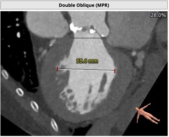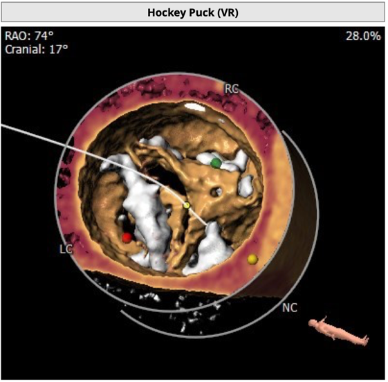 2 患者左冠开口偏低,左冠瓣瓣尖钙化,结合瓦氏窦内结构,存在较大左冠堵塞危险;
