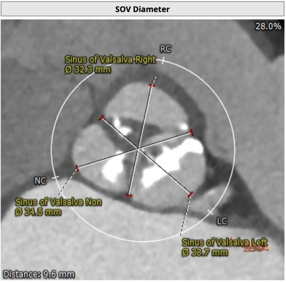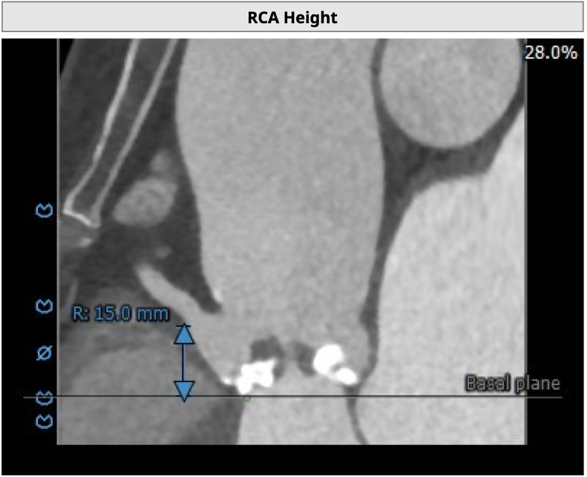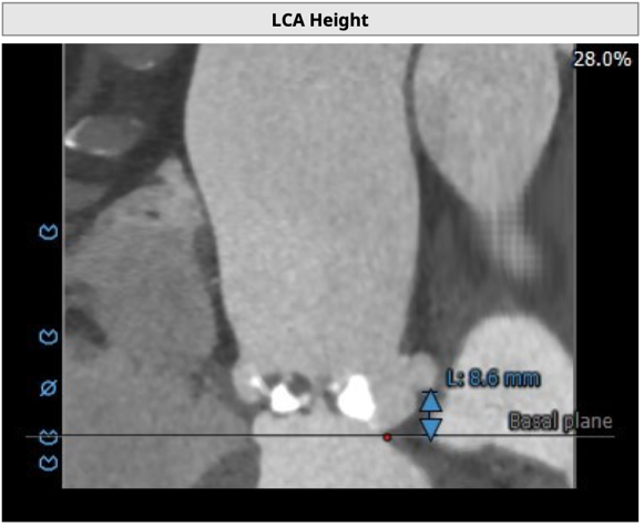 左冠开口高度8.6mm,右冠开口高度15.0mm,左冠高度偏低,左冠瓣瓣尖钙化明显,根据瓦氏窦内径和瓣叶长度综合判断,左冠存在较高堵塞风险;左心室后壁增厚。
