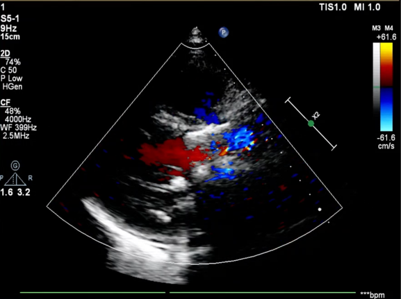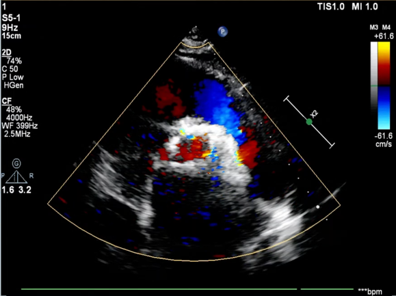 患者为76岁女性,术前超声心动图提示主动脉瓣重度狭窄并轻度关闭不全、峰值流速 5.1m/s、平均跨瓣压差 71mmHg、有效瓣口面积 0.32cm²;双房增大,升主动脉瘤样扩张,左室后壁增厚;二尖瓣轻度反流、三尖瓣中度反流;LVEDd:49mm,LVEF:29%,左心功能减退。