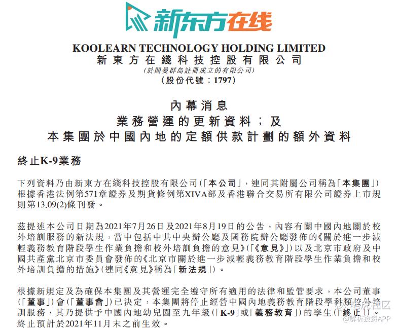 在此前,新东方旗下公司新东方在线曾发布公告称,将停止经营内地从幼儿园到九年级的培训服务(K9业务),预计于2021年11月末之前生效。