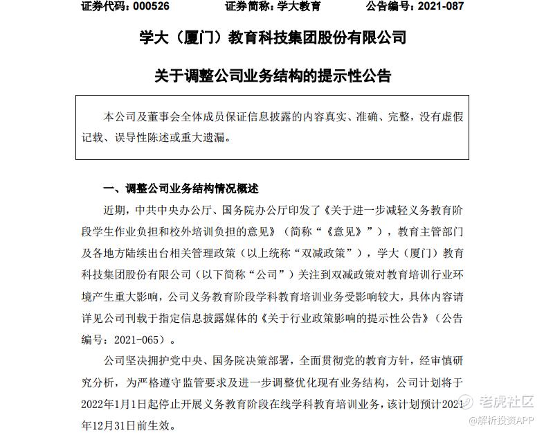 主打一对一教学的学大教育(000526)发布公告,公司计划将于2022年1月1日起停止开展义务教育阶段在线学科教育培训业务,该计划预计2021年12月31日前生效。