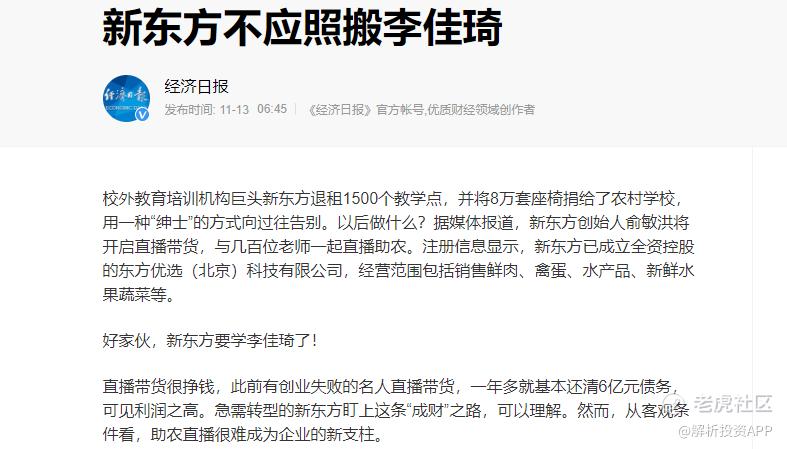 经济日报发表一篇名为《新东方不应照搬李佳琦》的评论文章,认为新东方不熟悉直播带货,且农产品带货风险大,“从一个挣快钱的行业跳到另一个挣快钱的行业,恐怕不是最佳示范。”