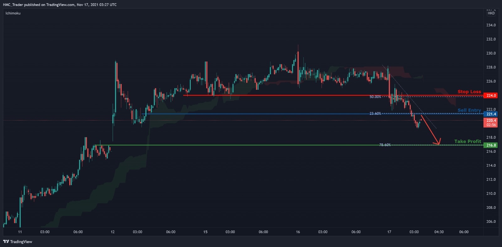 With the current downtrend and price being under ichimoku, I’m shorting from 221.4 where the horizontal overlap resistance and 23.6% Fibonacci retracement is, taking profit at 216.8 in line with the 78.6% Fibonacci retracement and stop loss at the 50% Fibonacci retracement and horizontal overlap resistance at 224.