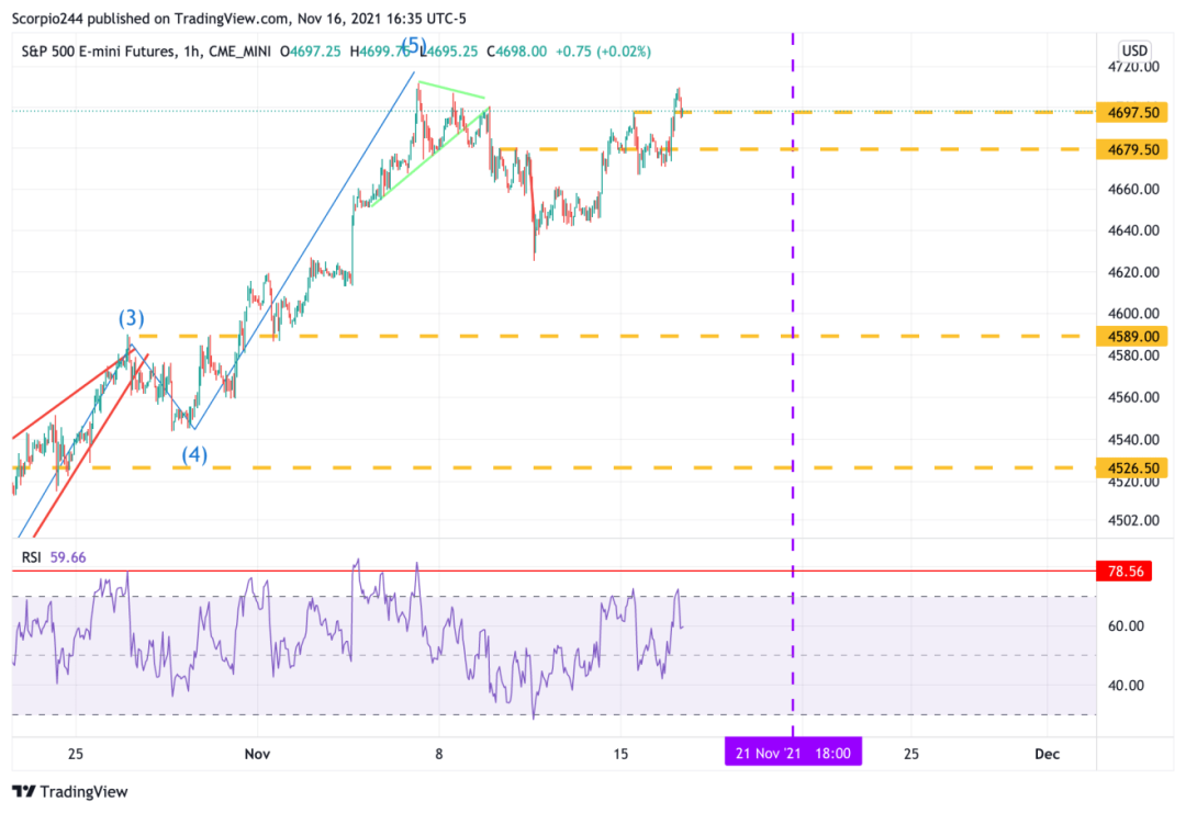 我对标普500指数的波浪计算几乎失效,不过仍成功维系住。我在昨天指出B浪可能相对A浪修正幅度过大。股市今天的走势就印证了我的疑虑,股指期货几乎触及11月的高点;不过仍未能超过那些高点。