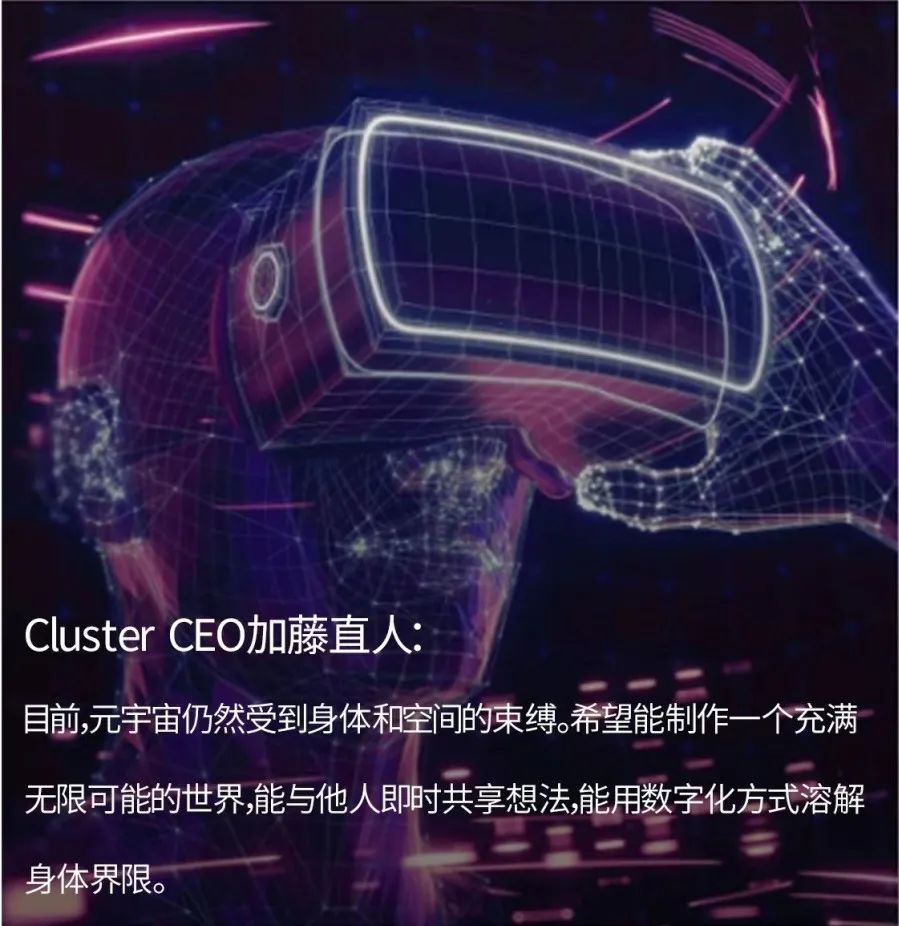 Cluster CEO加藤直人表示,目前,元宇宙仍然受到身体和空间的束缚。希望能制作一个充满无限可能的世界,能与他人即时共享想法,能用数字化方式溶解身体界限。