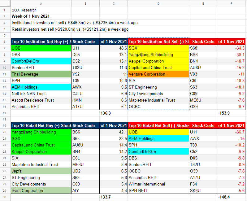 Here are the Institution buy & sell at SGX for the week of 1 Nov 2021, and some of my observations...