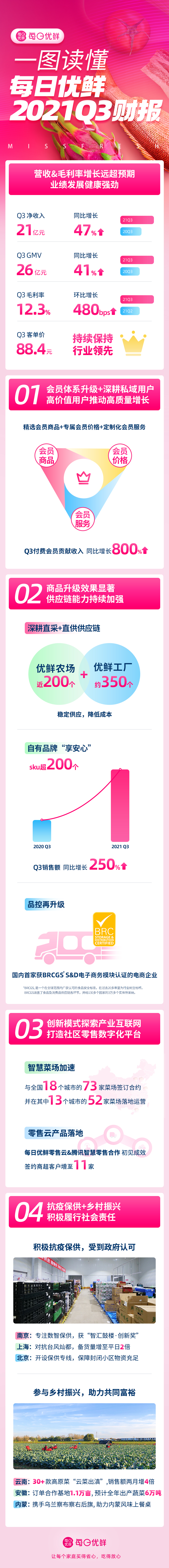 社区零售领军企业每日优鲜 $每日优鲜(MF)$ 公布了截至2021年9月30日的第三季度业绩报告。财报显示,每日优鲜净收入同比增长47.2%至21.2亿元,超过45%的增速指引上限。同时,其毛利率环比增长4.8个百分点至12.3%,超过3.5个百分点的环比提升指引上限。意味着在保持高速增长的同时,每日优鲜也在稳步提升经营效率,兼顾了增量和质量。