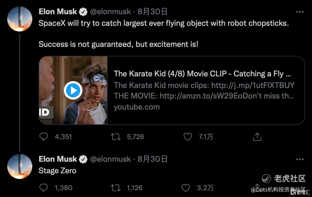 ▲对此马斯克举重若轻般的发推开玩笑:SpaceX试图用机器「筷子」捕捉有史以来最大的飞行体,不保证成功,但保准兴奋!」并且配上电影《空手道小子》一段幽默视频剪辑,男主试图用筷子夹住苍蝇的桥段。