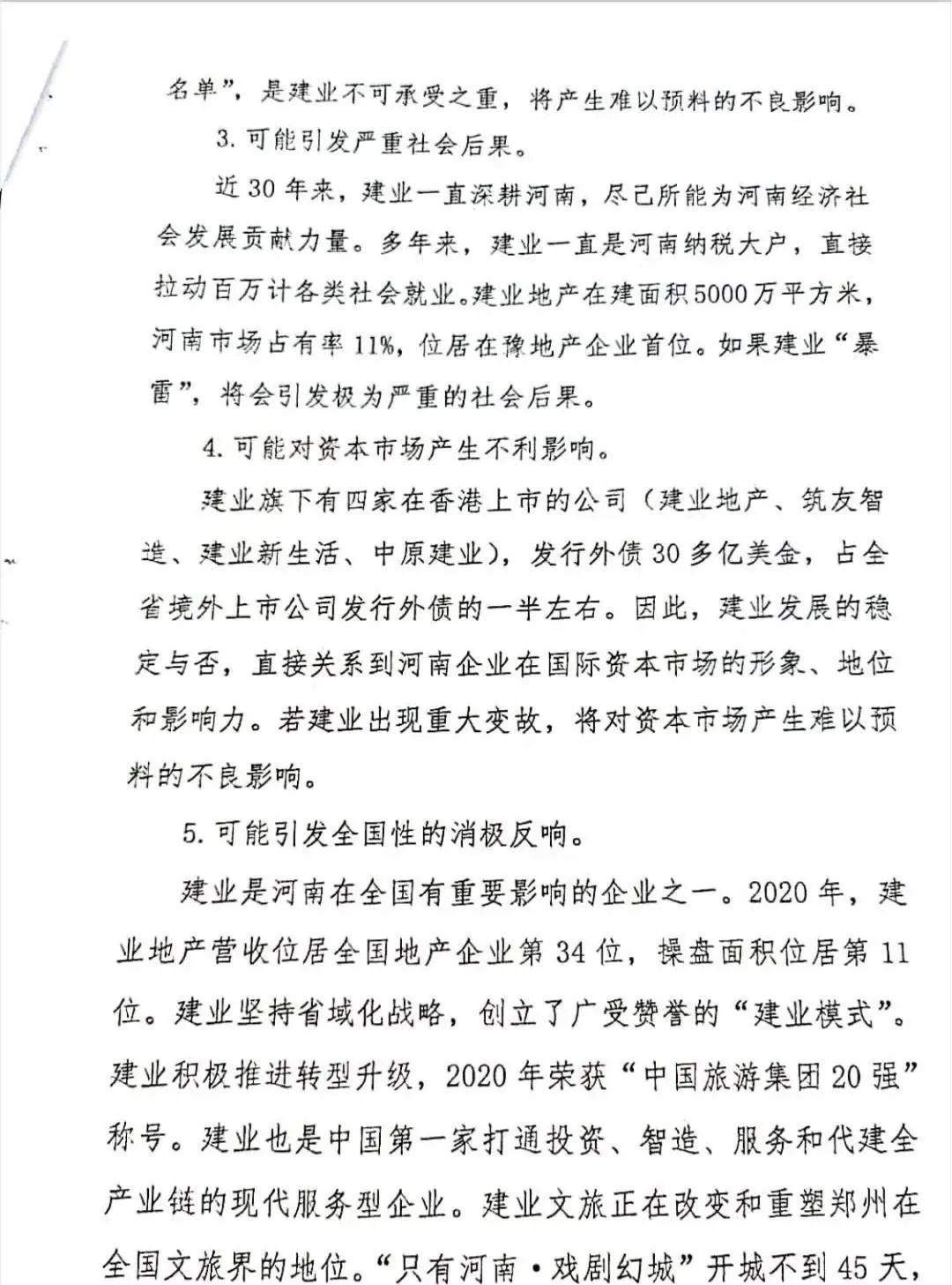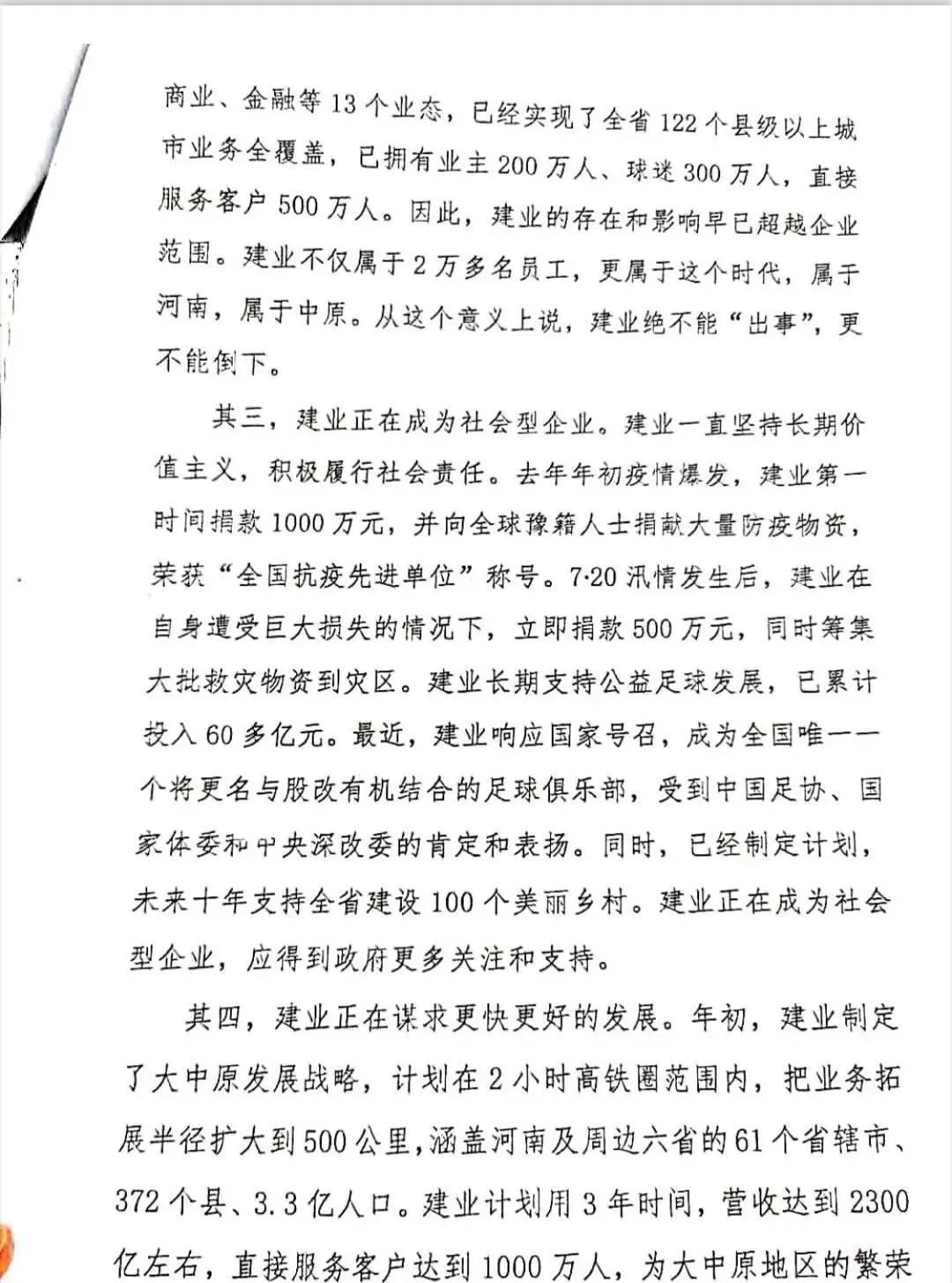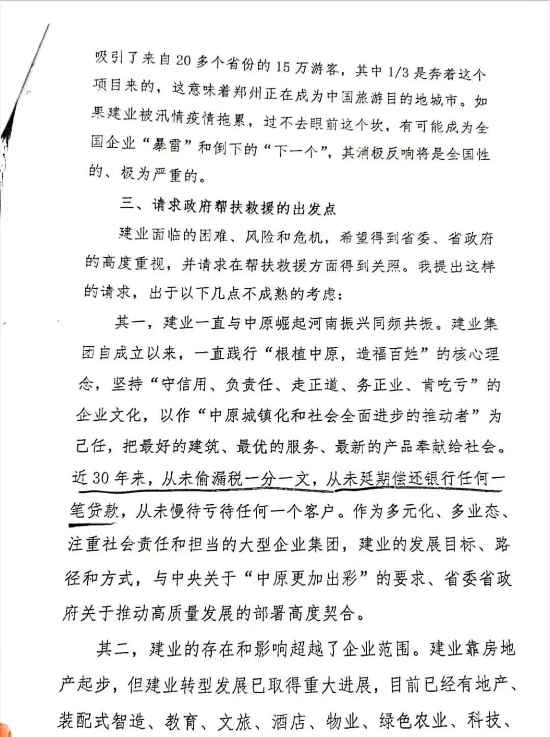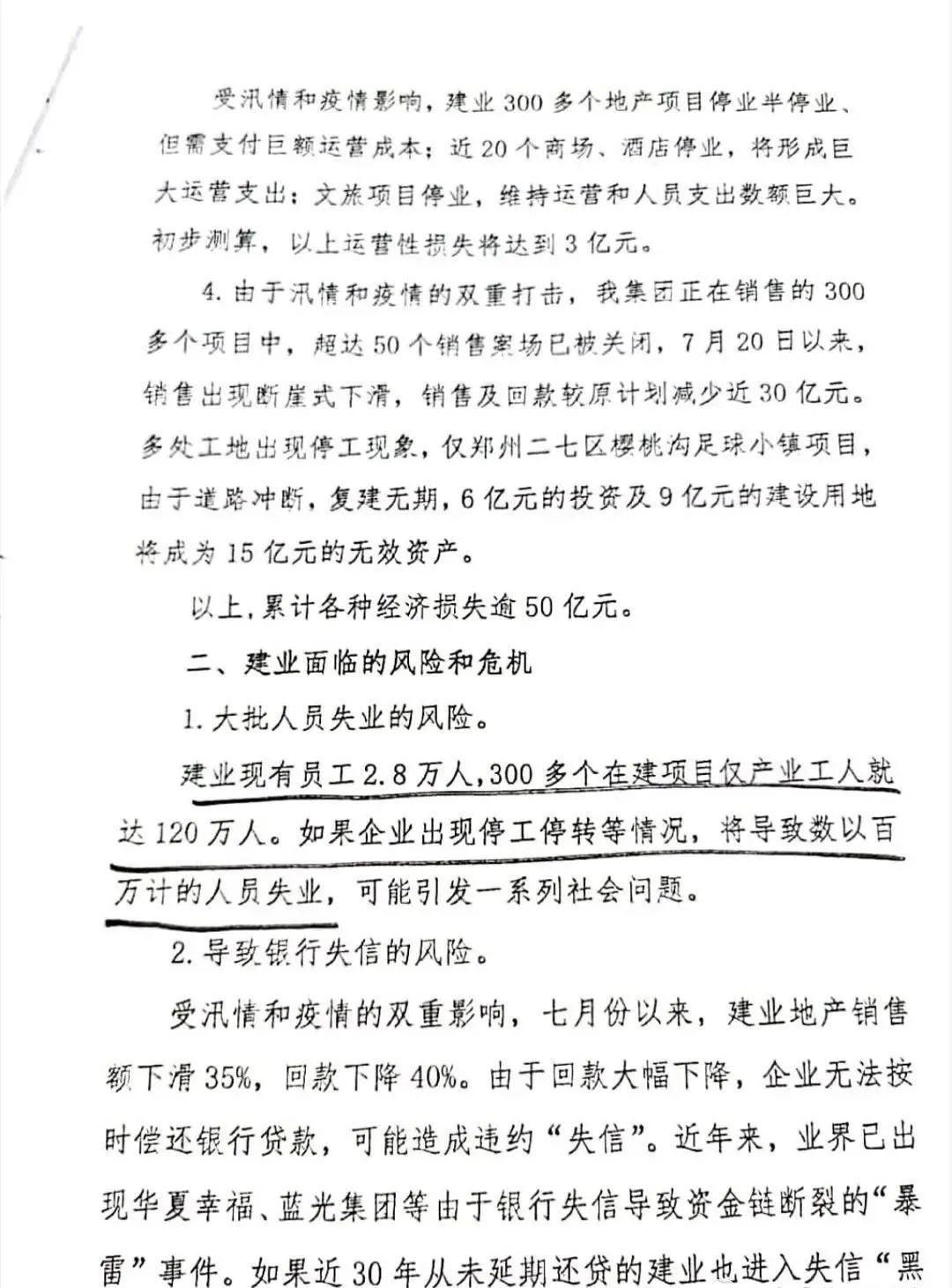 今日,建业集团向《财经》记者回应称,网传求助信内容真实,但困难是暂时的。随着8月底河南省疫情阶段性控制和各级政府在灾后重建恢复经营方面的大力支持,目前,建业多数业态和业务已恢复到正常经营状态,正在加速回暖。在政策帮助下,公司销售和延期交付等问题已经得到解决,目前现金流是安全的。