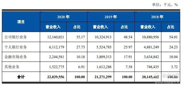 公司银行业务是沪农商行的主要收入来源。2018年至2020年,公司银行业务收入占总营收比例在50%左右或以上,年均收入近100亿。个人银行业务、金融市场业务、其他业务收入占比均低于30%。