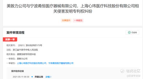 根据天眼查,美敦力公司以侵害发明专利纠纷为由,将心玮医疗诉讼至宁波市中级人民法院,案件已受理,开庭已延期。