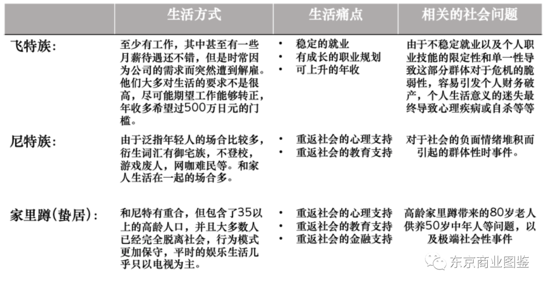 这三个群体之所以出名也是因为他们通常会和各种各样的社会问题连接起来,比如飞特族因为不稳定的雇佣环境导致心理疾病率的增加以及自杀率的增加,尼特族因为负面情绪的堆积而爆发群体性事件,家里蹲则啃老而导致80岁老人用退休金供养50岁中年人的问题。