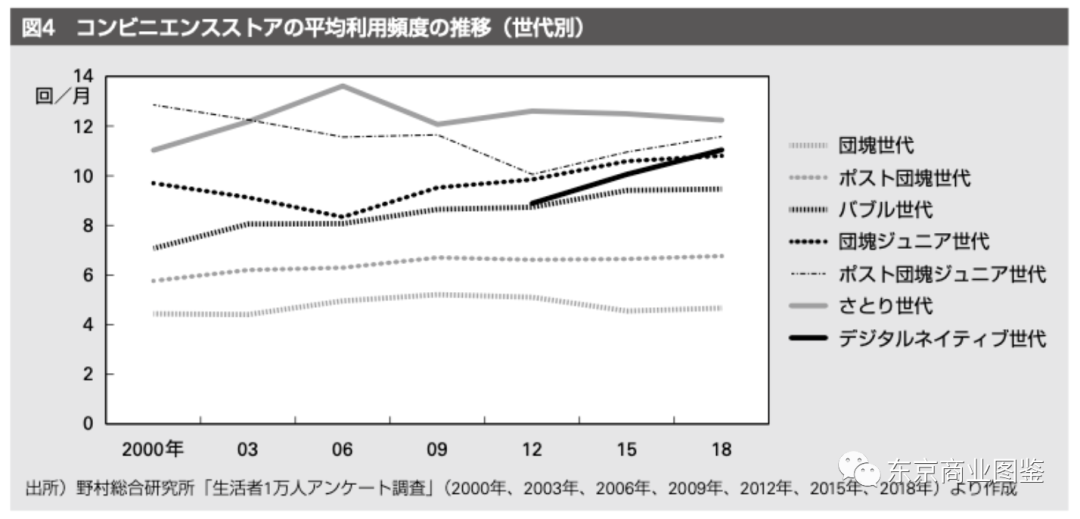 (图中黑色点线代表新团块世代的便利店使用频率,每个月多在10次以上,比他们使用频度更高的是更加年轻的世代)