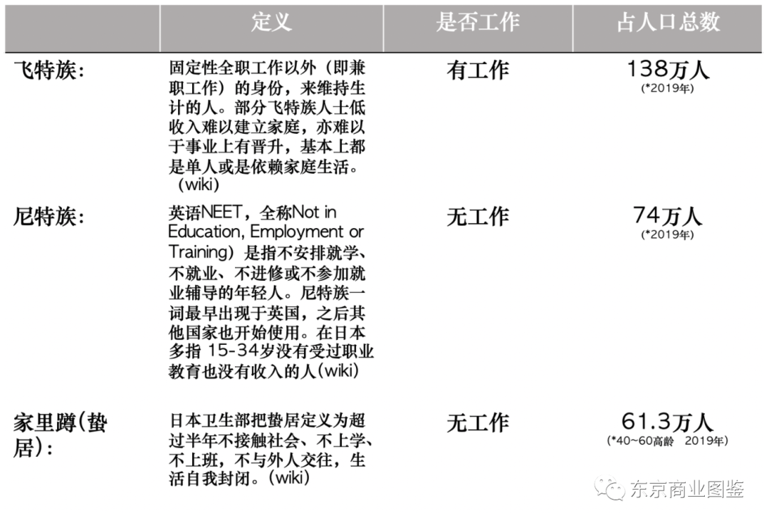 1991年日本泡沫经济随着不动产价格的暴跌正式宣告破灭,那一年本怀揣着梦想进入社会的毕业生们立即受到企业职位骤降的波及。在70年代前后出生的大量年轻人,他们被称为新团块世代(同一截点出生的很多人)在面对这样的突发状况有些顺从继续,有些叛逆离开,于是诞生了飞特族,尼特族,家里蹲这三个群体。他们是社会鲜明的符号,也是如今影响日本走向的一股力量。